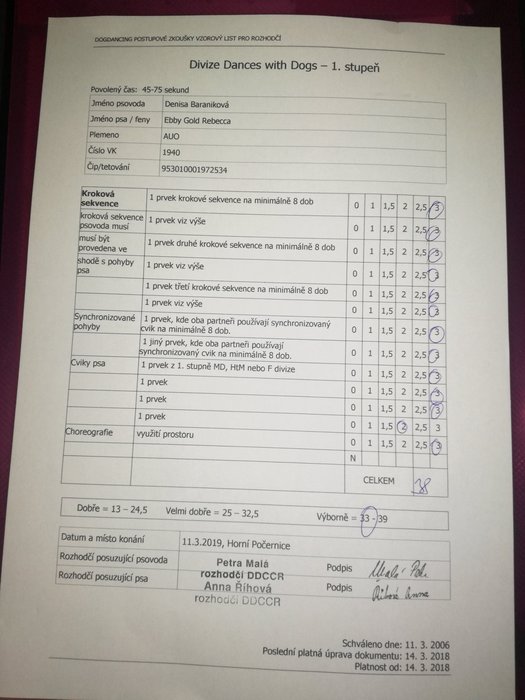 Verdikt je takový, že se nám naše první DD zkouška povedla složit až napočtvrté. Jak už tady bylo řečeno, jedna diskvalifikace byla v prvku psa, jednou se nám zkoušku povedlo složit, ale pouze na VD a napotřetí jsem nás diskvalifikovala já. Udělala jsem s Ebby otočky z F1 místo Dwd1.